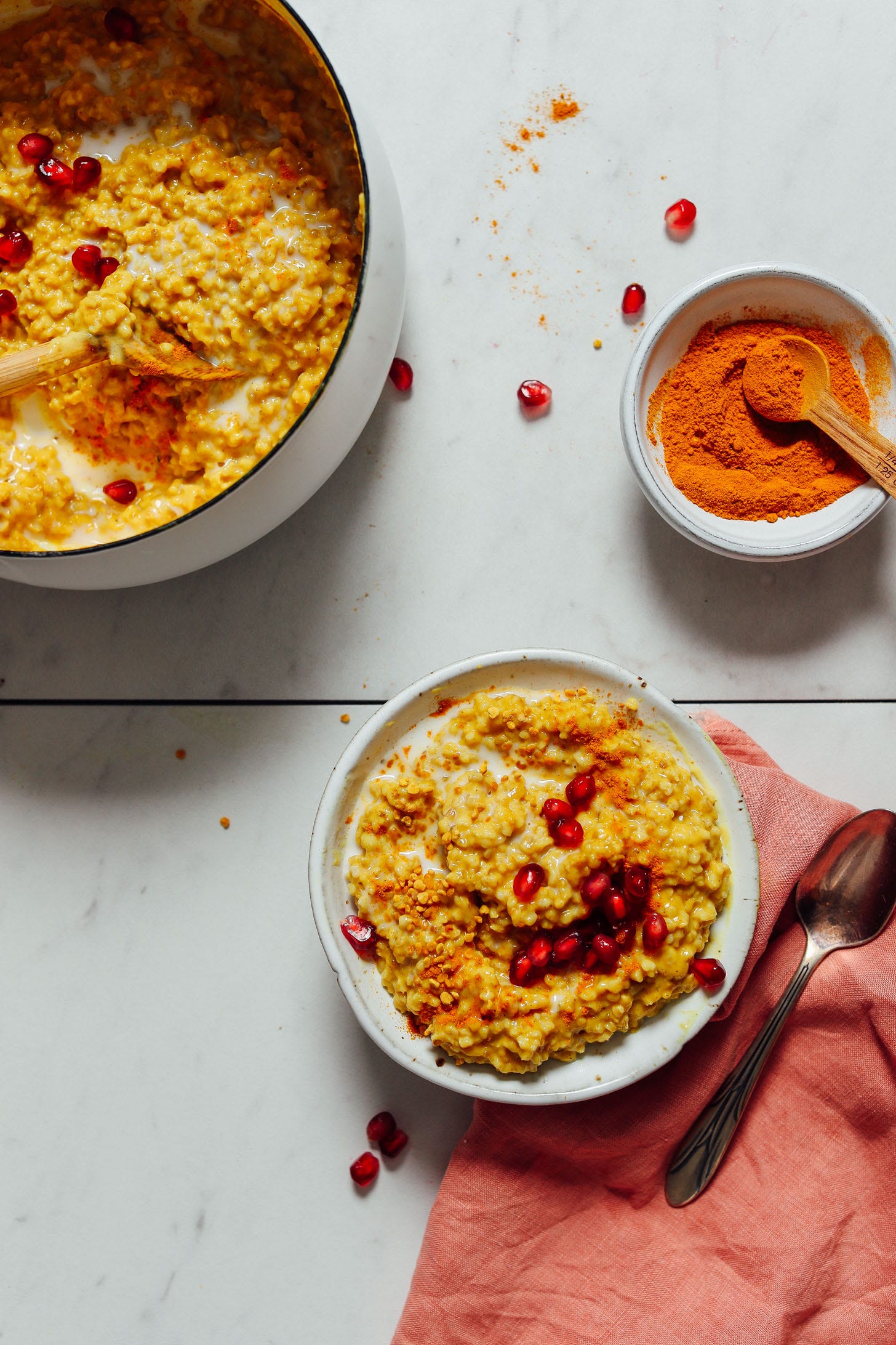 There are mornings when you want breakfast to feel like medicine in the best sense of the word. This turmeric porridge is that. Steel-cut oats soaked overnight, then simmered in coconut milk with golden milk spices: turmeric, ginger, cinnamon, a whisper of black pepper. The color alone is enough to make you feel something has shifted. I like to top mine with pomegranate seeds and a drizzle of maple syrup, the tartness cutting through the warmth like a bright note in a low chord. It takes a little forethought, the soaking, the slow simmer, but that is part of the point. You are worth the extra twenty minutes. This is not a breakfast you eat while scrolling. It is a breakfast that asks you to sit down and be present for the first meal of your day. The golden spices have been used for thousands of years in Ayurvedic tradition, and while I am not here to make health claims, I will say this: eating something this beautiful in the morning changes the way the rest of the day feels.